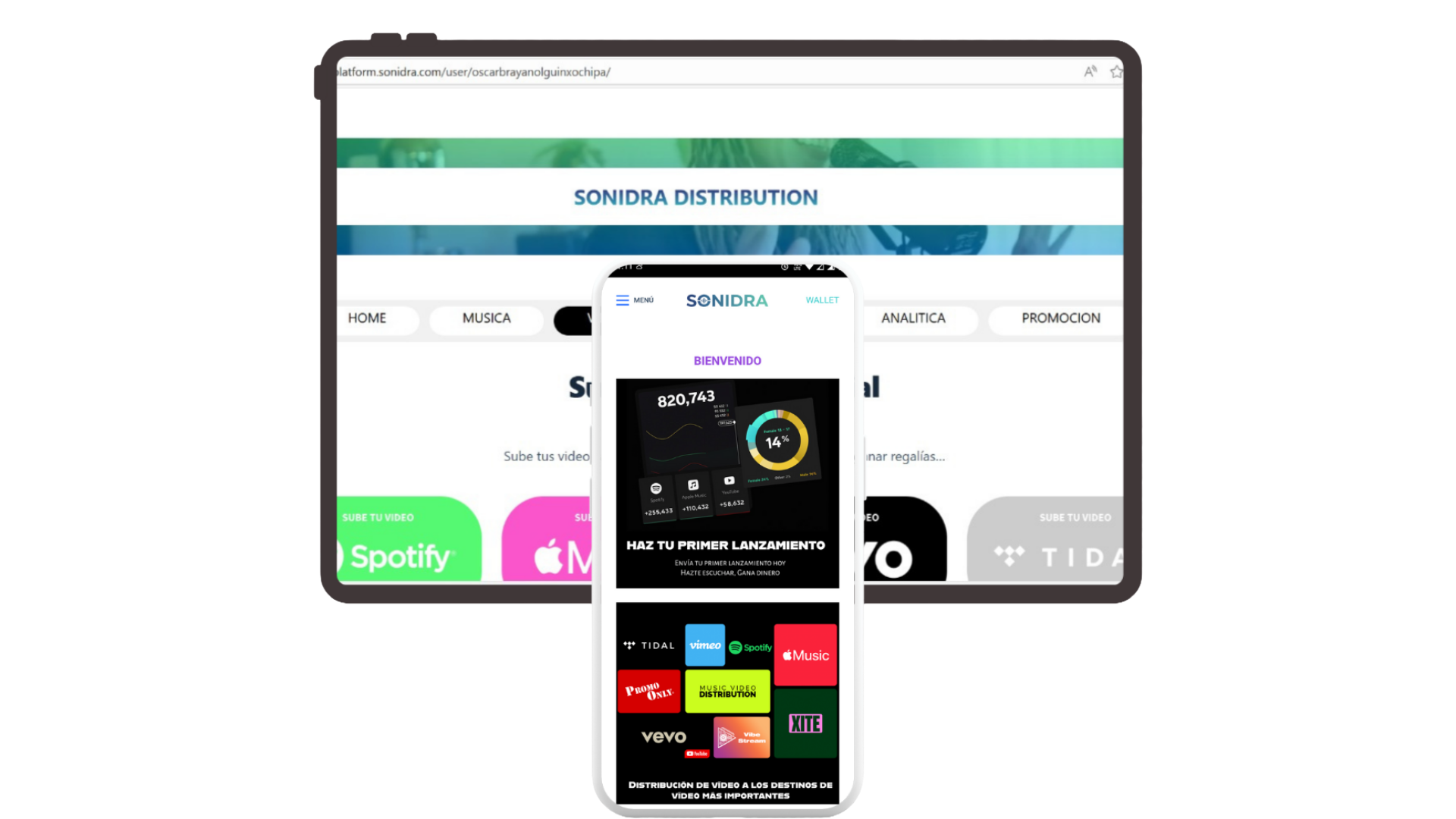 Distribuir tu música nunca ha sido tan fácil. Descargue la aplicación Sonidra Movil para lanzar canciones en Spotify, Apple Music, YouTube, Amazon Music, TikTok y cualquier otro servicio importante de transmisión de música en minutos.